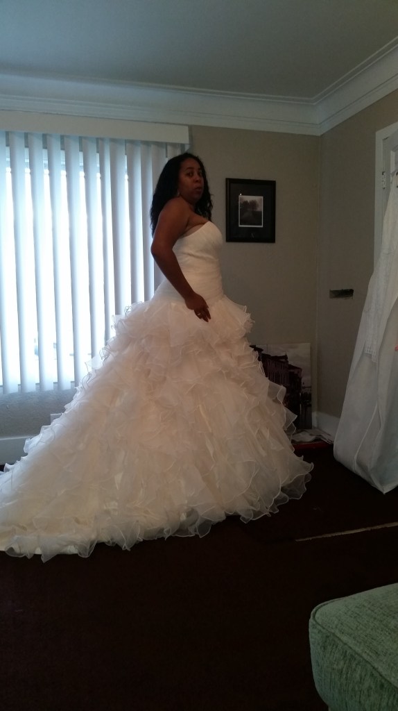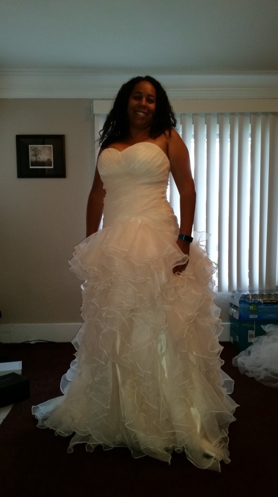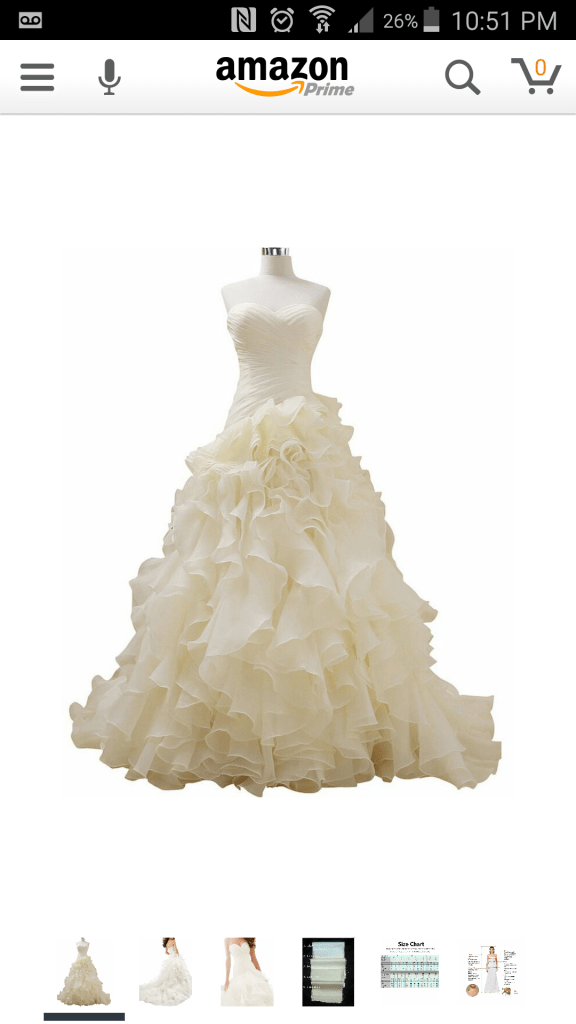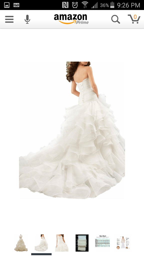 Let me explain why. My husband and I were on a tight budget for our wedding, as we had to pay for it ourselves, while moving into our first home together and taking care of combined four kids! and although I have champagne tastes, I didn’t have that kind of budget. lol I went to several wedding dress stores. I took my maid of honor once, I took my fiance’ and two youngest kids once (I don’t recommend this lol), and even went with my future Sister-in-Law and oldest step-daughter. After being crushed and disappointed by what I thought I wanted as dress style (the mermaid style looked horrible on me), I finally found what DID work, but of course the price tag was a little high. 😦 SO, I started looking online.